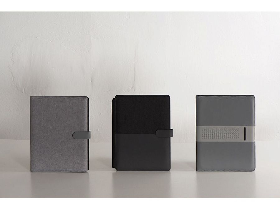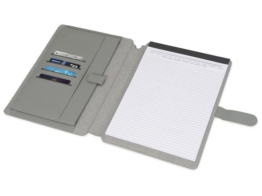 Стильная папка для документов формата А4 с комбинированной обложкой из текстиля и искусственной кожи. Удобный внутренний органайзер имеет карман на застёжке для планшета, блокнот для записей с линованной бумагой.