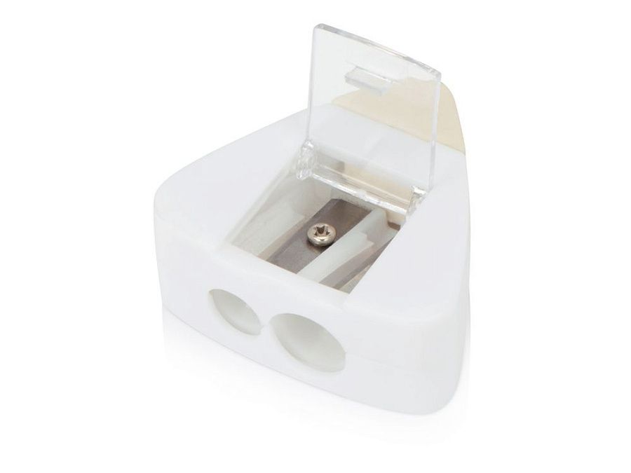 Точилка для карандашей разного диаметра и ластик в одном корпусе. Большое поле для нанесения логотипа.