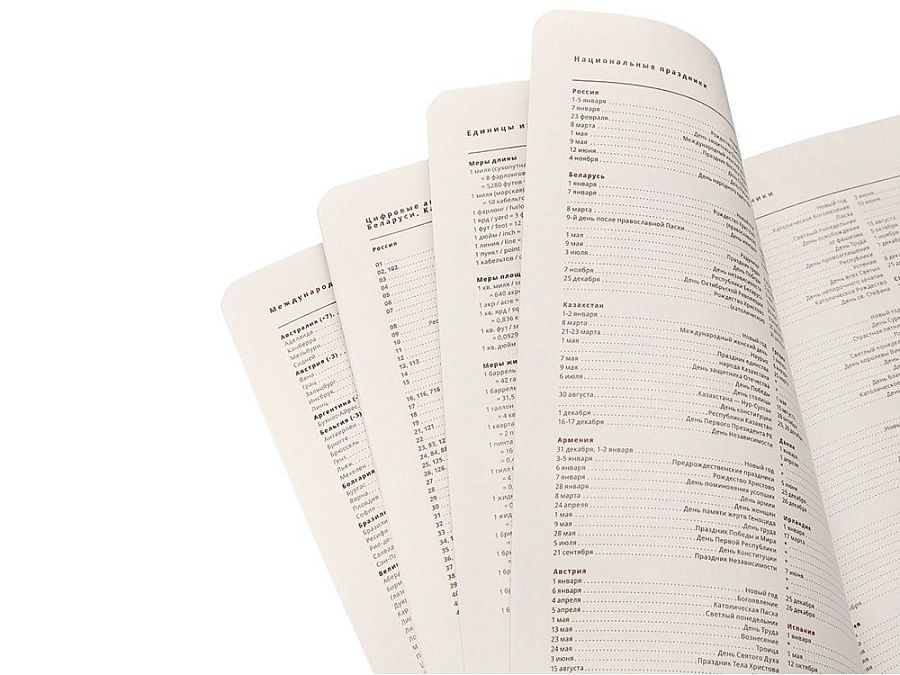 - раздел справочной информации на 17 страницах (часовые пояса, аэропорты Европы, международные телефонные коды, размер одежды, телефонные коды России, Беларуси, Казахстана, Армении, цифровые автомобильные коды, римские цифры, расход калорий при физической нагрузке, формат бумаги, десятичные приставки, единицы измерения, греческие буквы, штрихкоды, время распада алкоголя в крови, города-миллионники, национальные праздники, термины международной торговли, температура, скорость, давление, буквенные коды стран, энергетическая и питательная ценность продуктов, страны мира, заметки);