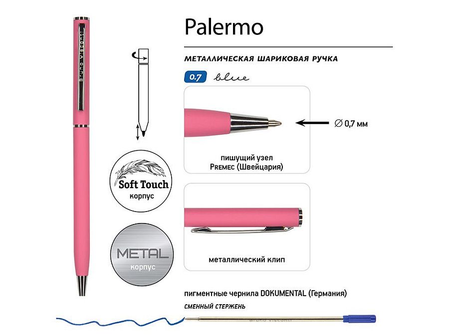 Автоматическая металлическая ручка "Bruno Visconti" серии "Palermo" однотонного цвета порадует любителей всего изящного и утонченного. Покрытие корпуса Soft Touch гарантирует дополнительный комфорт в работе с ней. Стержень легко выдвигается благодаря поворотному механизму. Синие пигментные чернила Dokumental (Германия) и пишущий узел Premec (Швейцария) обеспечивают качественное и мягкое письмо.