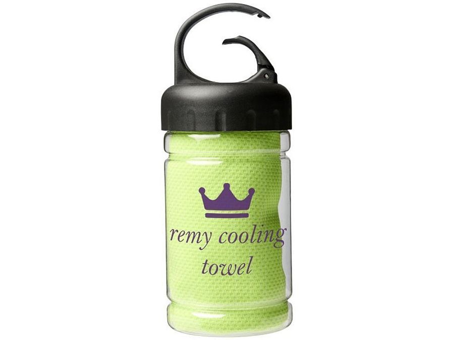Охлаждающее полотенце Remy в ПЭТ-контейнере. Быстро впитывающее, быстро сохнущее и стираемое охлаждающее полотенце сохраняет прохладу во время тренировок или любых других занятий на свежем воздухе. Поставляется в ПЭТ-контейнере с ручкой и встроенным карабином для удобной переноски. Доступно в 5 ярких цветах. На контейнере изображен большой логотип, он также может быть и на самом охлаждающем полотенце. Размер: 30 x 80 см. PET. 0,096.