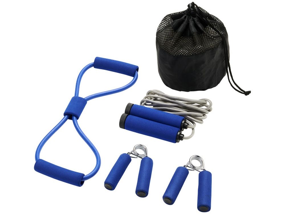 Набор для фитнеса «Dwayne» содержит весь спортивный инвентарь, необходимый для полноценной тренировки. Два кистевых эспандера, скакалка и грудной эспандер в соответствующем цветовом исполнении. Для удобной переноски поставляется в сетчатом мешочке, на котором можно сделать нанесение. Полиэстер.