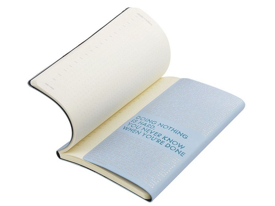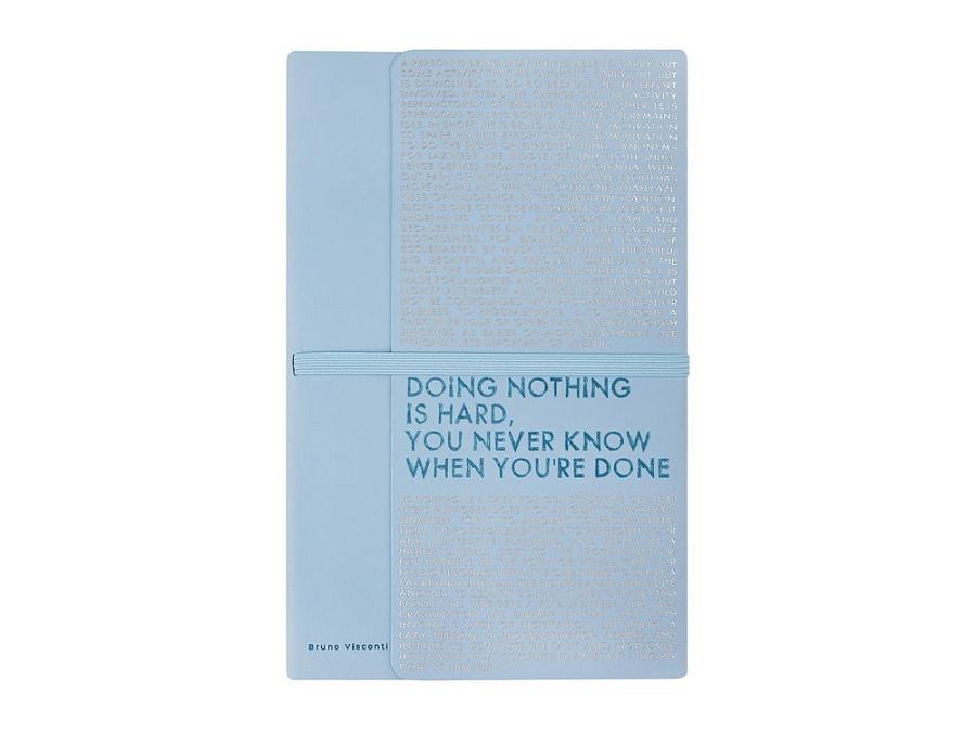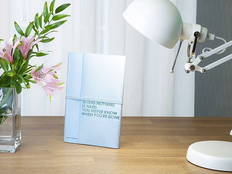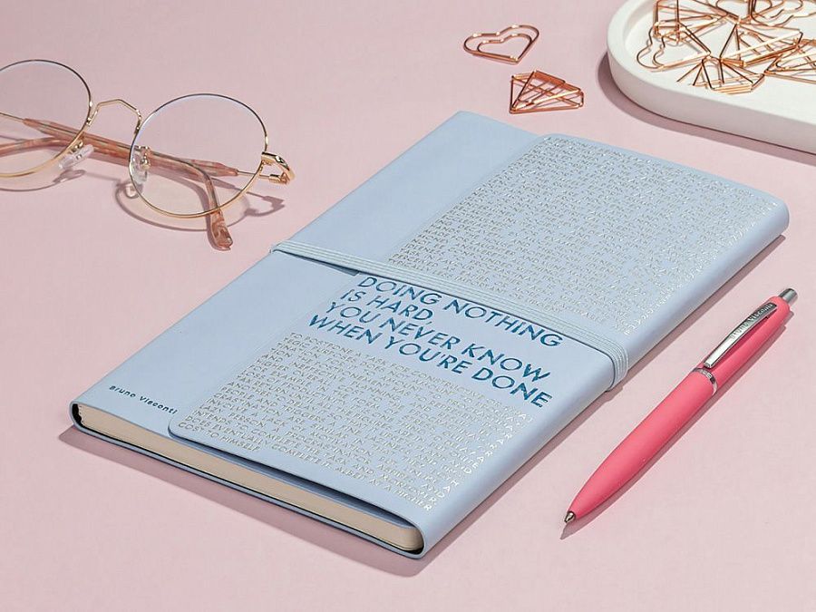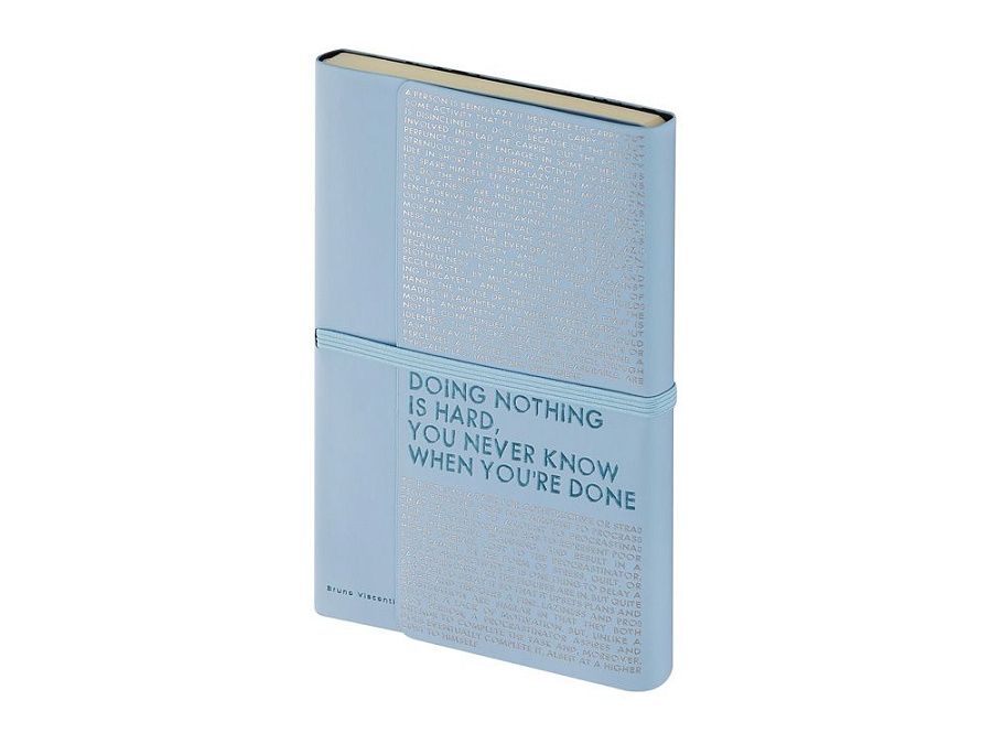 Так трудно ничего не делать, ведь совершенно непонятно, когда ты закончишь! Лаконичный слоган мотивирует к активным действиям. Планируй и завершай! Вот что кроется в элегантной надписи, выполненной золотым тиснением! А Flex обложка напоминает «Будь гибким! Великолепный недатированный ежедневник Bilbao черно-синего цвета с тиснением фольгой. Бежевая бумага 65 г/м, широкая горизонтальная фиксирующая резинка. Гибкая обложка с покрытием Soft-touch. Особенность этого ежедневника - часть обложки внахлест может использоваться как закладка. Ежедневник упакован в картонный полукороб и термопленку.