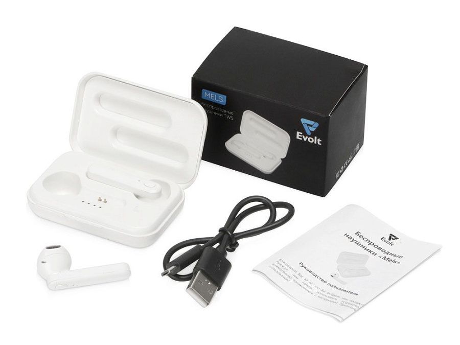 Беспроводные наушники «Mels» бренда Evolt обеспечивают до 16 часов суммарного воспроизведения музыки и работают на расстоянии до 10 метров от сопряженного с ним смартфона или иного гаджета. Зарядный чехол имеет разъем mini USB, внутри которого есть шкала заряда, состоящая из четырех делений.
