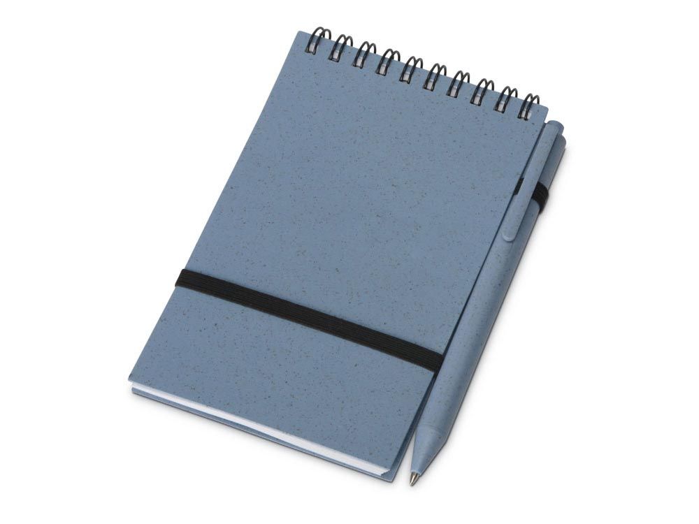 Блокнот с обложкой из переработанной пшеницы и пластика. Блок состоит из 60 листов переработанной бумаги белого цвета. Крепление - пружина. В комплекте шариковая ручка из пшеничной соломы.
