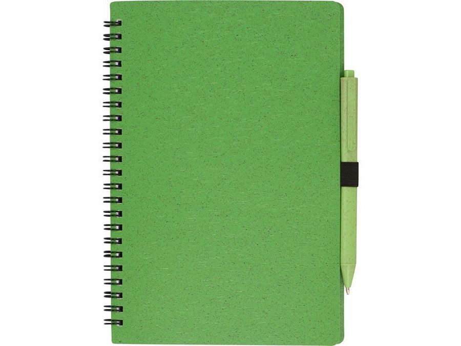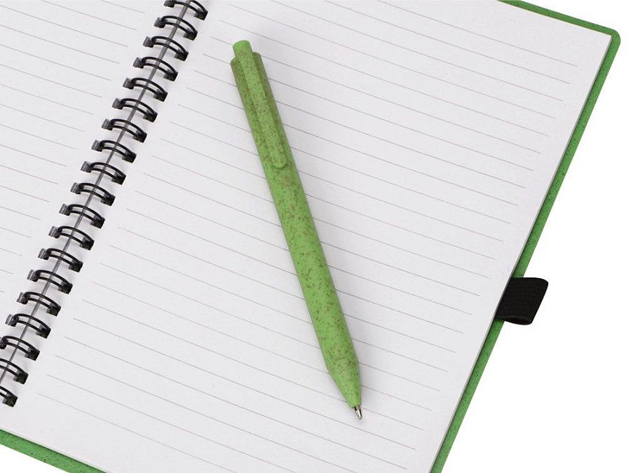 Блокнот с обложкой из переработанной пшеницы и пластика. Блок состоит из 80 листов переработанной бумаги белого цвета. Крепление - пружина. В комплекте шариковая ручка в тон блокноту из пшеничной соломы.