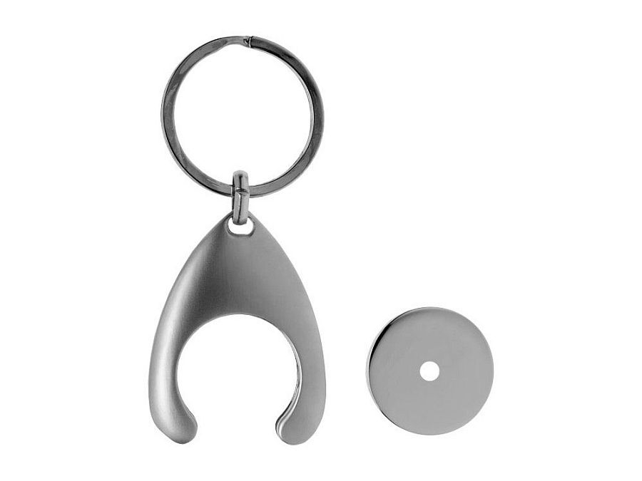 Брелок-держатель для монет для тележек. Держатель для монет достоинством 1 евро размером Ø 6 мм незаменим при поиске монеты для покупательской тележки в супермаркете. Включает черную подарочную коробку. Цинковый сплав.