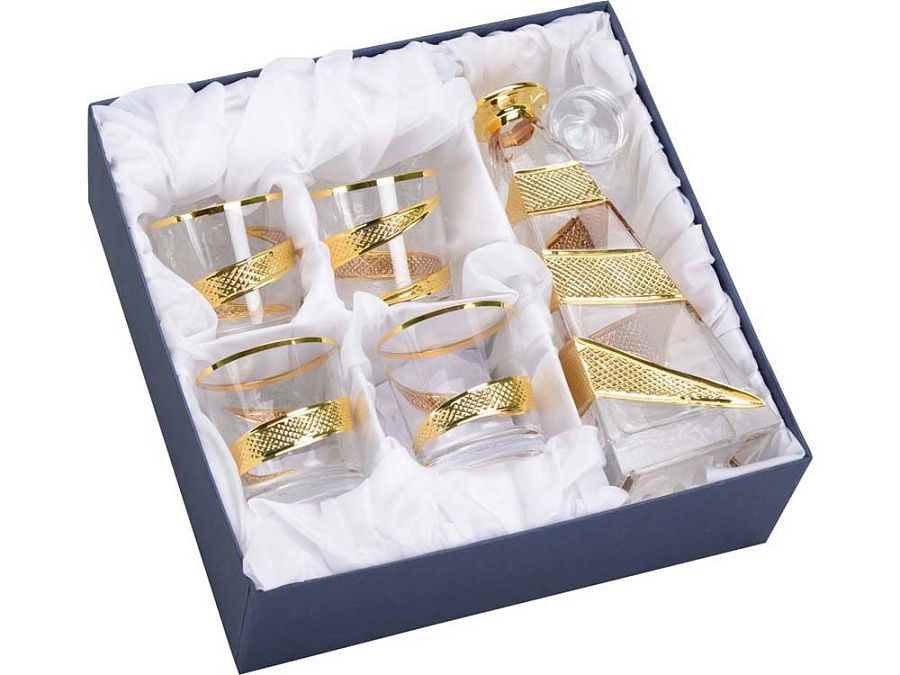 Набор для виски состоит из графина пирамидальной формы и 4 бокалов. Набор выполнен из тонкого хрусталя, украшенного позолотой. Графин станет непременным атрибутом неформальной встречи с ключевыми партнерами.