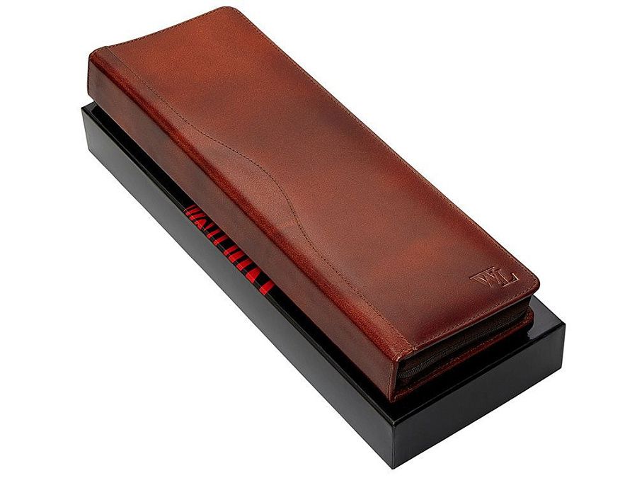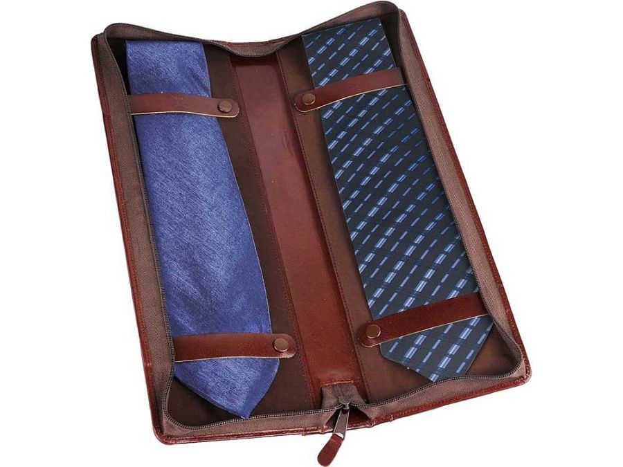 Компактный чехол для хранения галстуков оснащен двумя креплениями. Чехол выполнен из натуральной кожи коричневого оттенка. Благодаря чехлу аккуратно хранить и брать с собой галстуки в командировку стало еще удобнее.