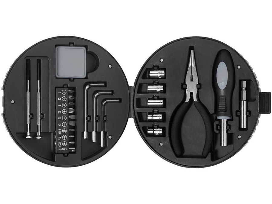 Набор из 25 инструментов включает измерительную минирулетку, крестообразную отвертку, плоскую отвертку, 9 насадок с адаптером (4 крестообразных шлицев, 2 плоских шлица и 3 шестигранных шлица), 3 шестигранных ключа, 5 головок (5-9 мм), острогубцы, рукоятку отвертки, адаптер для насадок и удобный футляр.