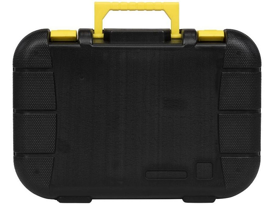 Инструментальный ящик с замком и складной ручкой, включающий молоток-гвоздодер, отвертку с плоским шлицем 4 мм, универсальные плоскогубцы, универсальный нож с фиксатором, 5 шестигранных ключей (2-6 мм) с держателем со стандартными и шаровыми наконечниками, измерительную рулетку длиной 3 м с фиксатором, индикаторную отвертку, изоляционную ленту и 4 прецизионных отвертки. Пластик ABS.