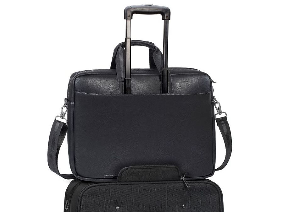• На задней панели имеется карман на молнии для крепления сумки к ручке чемодана.