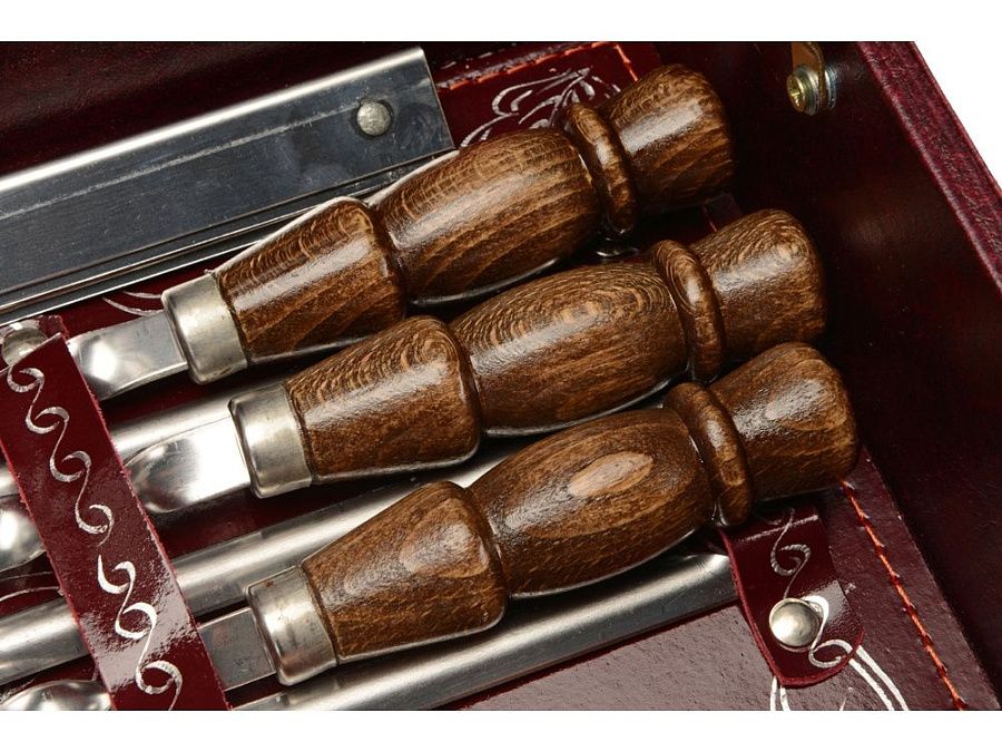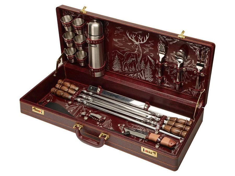 стопка- 6шт, термос, вилка- 6шт, ложка- 6шт, вилка для барбекю, нож, ножки для мангала- 2шт, шампур- 6шт, штопор, нож "Проводник"