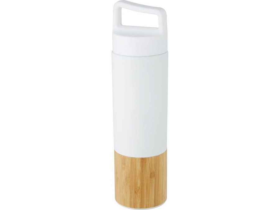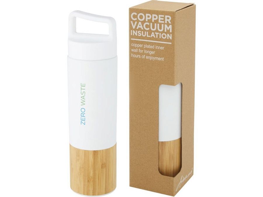 Термобутылка из нержавеющей стали 18/8 с медной вакуумной изоляцией, которая сохраняет напитки горячими или холодными в течение нескольких часов. Имеет модный элемент из бамбука; бутылку легко носить с собой благодаря ручке на верхней части крышки. Бутылка имеет широкое горлышко, поэтому ее легко наполнять и мыть. Протестировано и одобрено согласно немецкому законодательству о безопасности пищевых продуктов (LFGB), а также проверено на содержание фталатов согласно нормам REACH. Объем 540 мл. В коробке из переработанного картона. Нержавеющая сталь, бамбук.