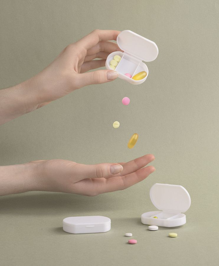 Антибактериальная таблетница включает три отделения и крышку на защелке. Компактный и удобный формат для хранения лекарственных средств, БАДов, витаминов в форме таблеток и капсул.