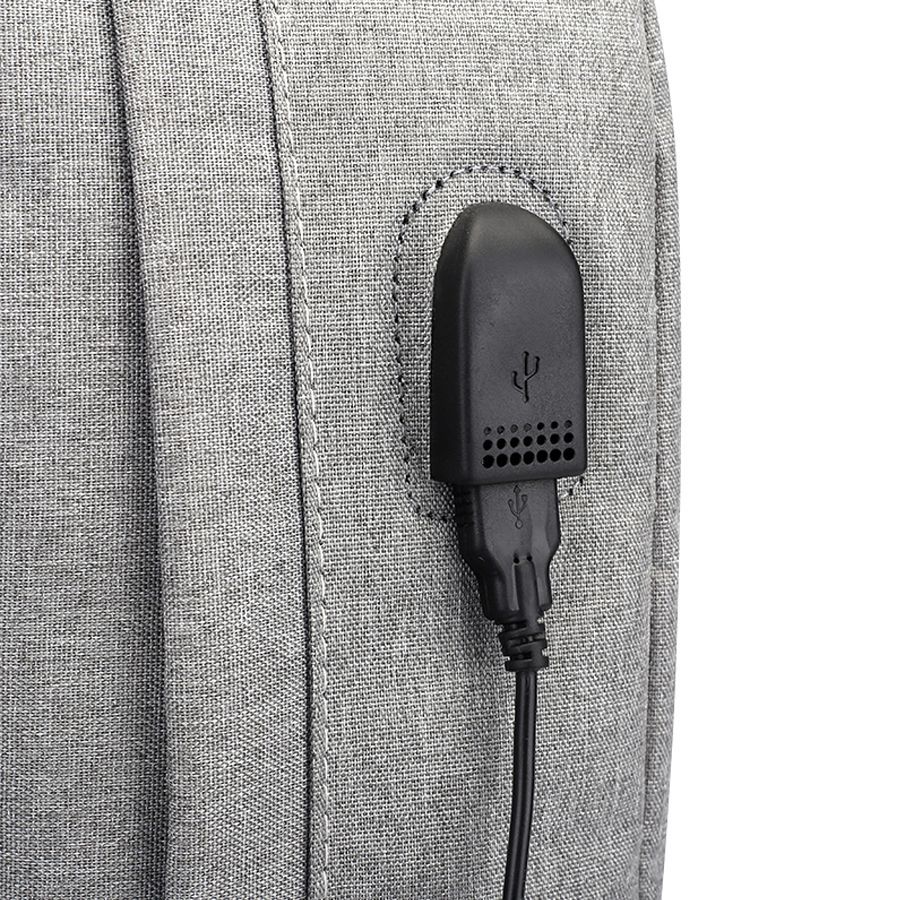 На передней стенке два кармана карман на скрытых молниях. Сбоку два открытых кармана и USB-разъем с проводом для подключения внешнего аккумулятора.