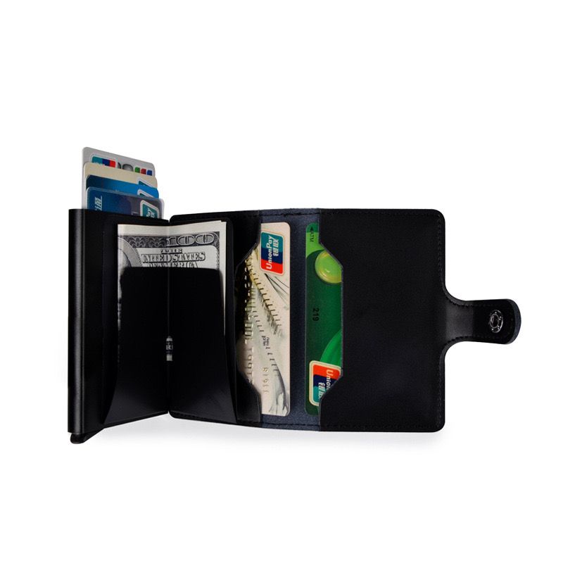 Солидный практичный держатель для банковских карт Bakara с покрытием из экокожи книжного типа и возможностью закрывать, а также функцией RFID, чтобы защитить карты он несанкционированного копирования. Имеет нижнюю кнопку для быстрого извлечения карт.
