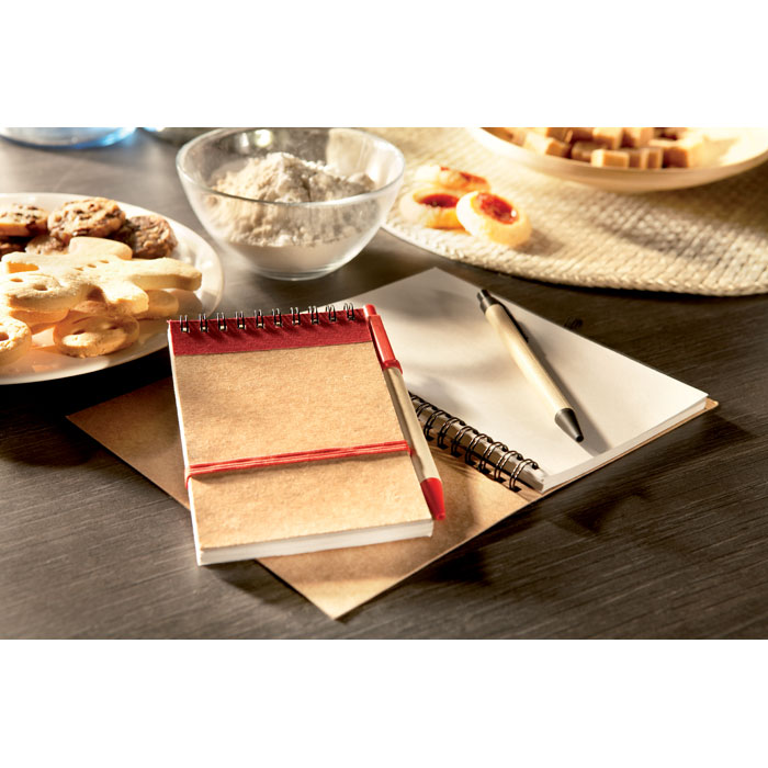 Карманный блокнотик с ручкой. Блок 70 стр. из вторично переработанной бумаги. Застегивается на резинке. Синие чернила.