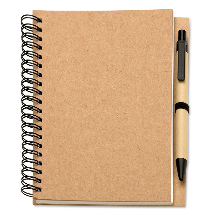 Блокнот с картонной обложкой. Включает 70 страниц вторично переработанной бумаги и синюю шариковую ручку из биопластика.