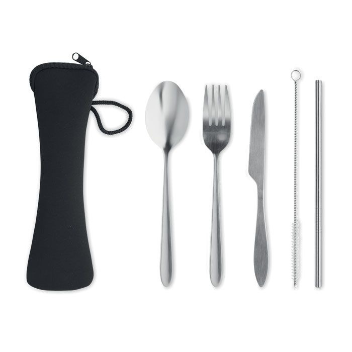Набор столовых приборов из нержавеющей стали. В комплекте вилка, нож, ложка, трубочка и щеточка. Все в неопреновом чехле.