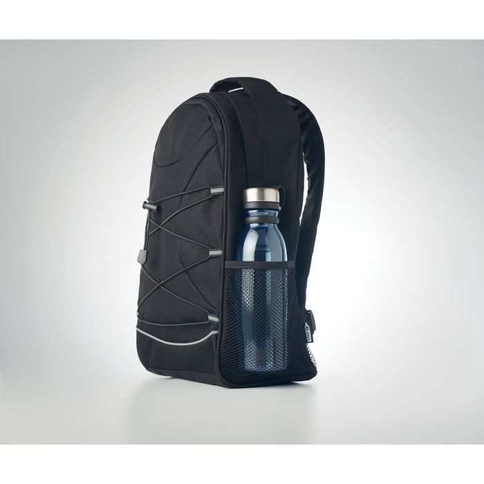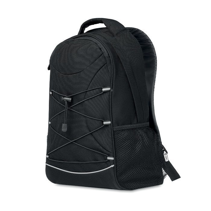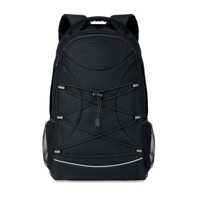 Рюкзак из RPET 600D с темными шнурками спереди и светоотражающей передней панелью. Сетчатые карманы с двух сторон.