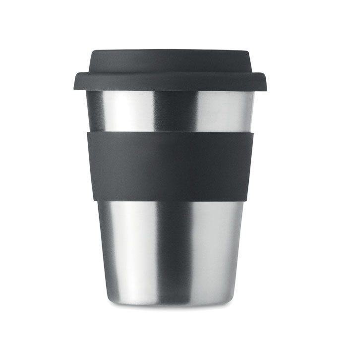 Одностенная термокружка из нержавеющей стали с силиконовой крышкой и манжетой. Емкость 350 мл. Возможно нагревание стенок.
