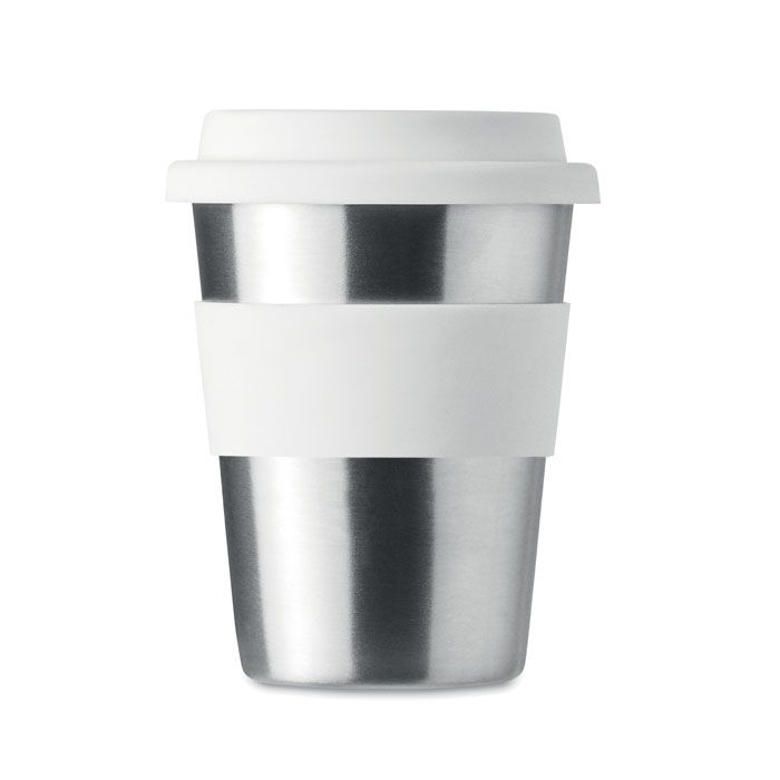 Одностенная термокружка из нержавеющей стали с силиконовой крышкой и манжетой. Емкость 350 мл. Возможно нагревание стенок.