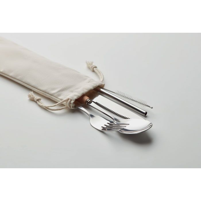 Набор столовых приборов многоразового использования из нержавеющей стали с деревянной отделкой в холщовом мешочке. Включает нож, вилку, ложку, соломинку из нержавеющей стали и щеточку для чистки.