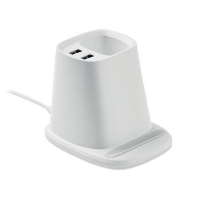 Настольная подставка для ручек и смартфона с беспроводной зарядкой 10 Вт и 2 портами USB. Выход: DC 9V/1.1A (10W) для быстрой зарядки. Совместим с последними моделями Androids, iPhone® 8, X и новее.