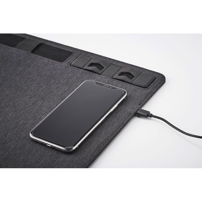 Коврик для мыши из 300D RPET с функцией б/п зарядного устройства 15Вт и подставкой для телефона. Выход: DC 9V/1.6A (15W) для быстрой зарядки. Совместим с последними Androids, iPhone® 8 и новее.