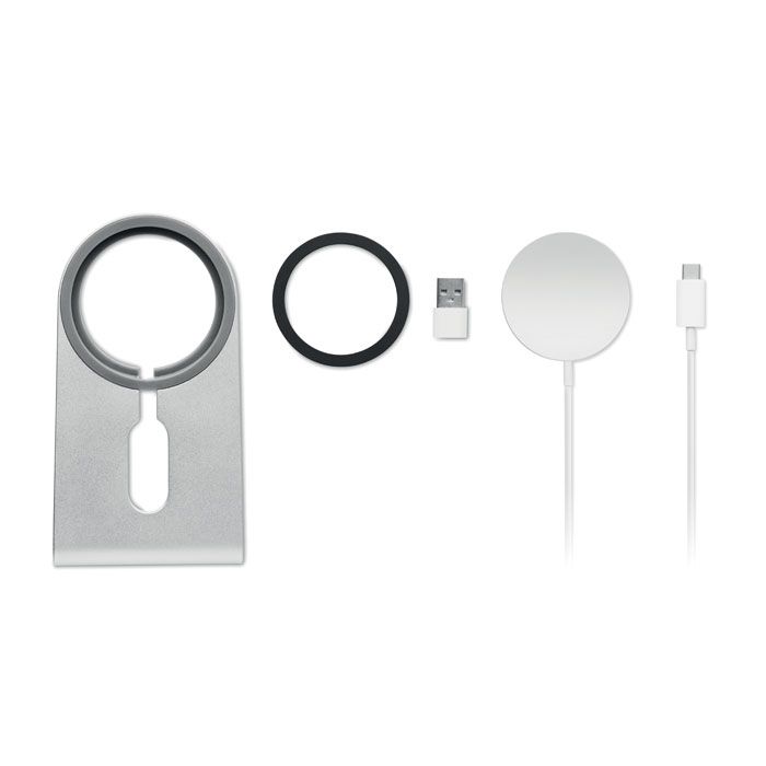 Б/п зарядка 15 Вт на магните с подставкой для телефона. Включает металлическое кольцо для зарядки дополнительных устройств, поддерживающих функции б/п зарядки. Выход:9В/1,67 А(15 Вт) для быстрой зарядки. Совместимо с последними Androids, iPhone® 12 и новее.