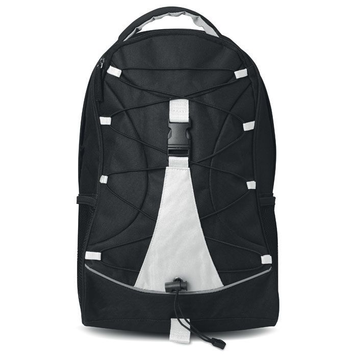 Черный рюкзак из полиэстера с цветной лицевой стороной. Шнуровка на лицевой стороне позволяет организовать дополнительный объем для хранения.