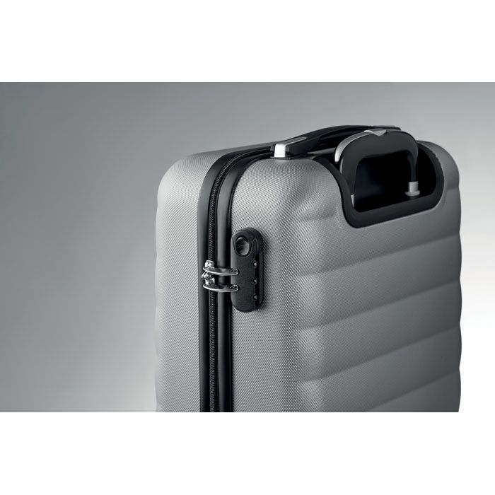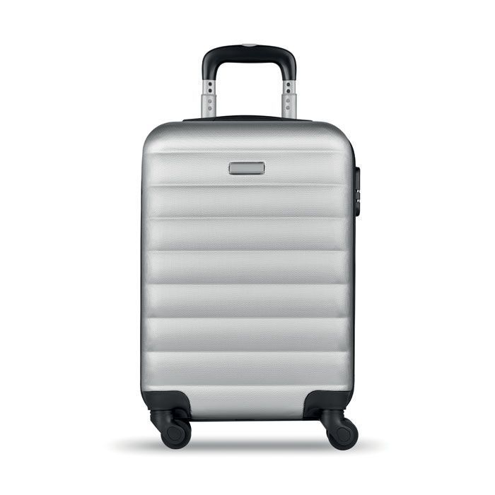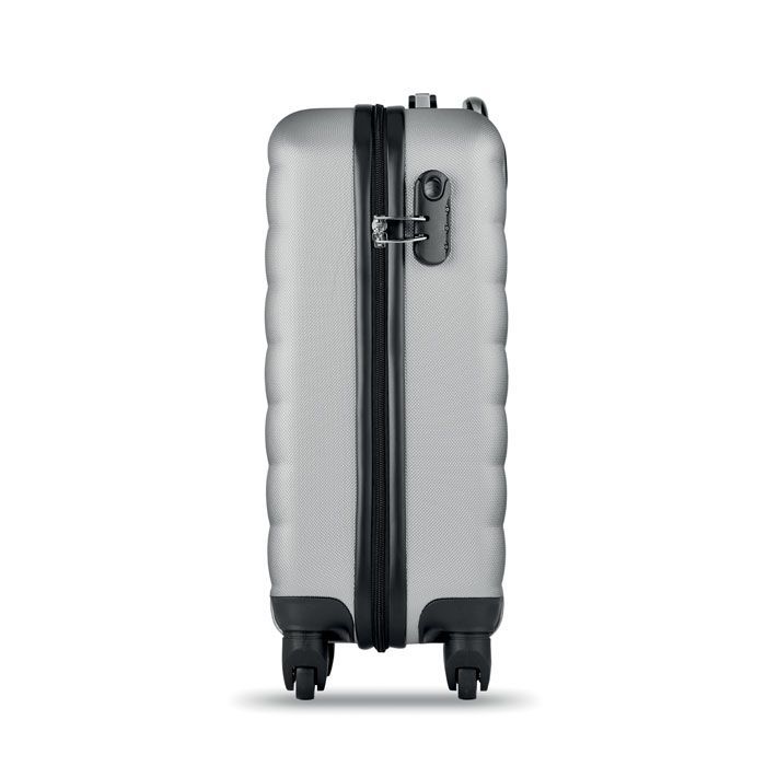 Чемодан из прочного пластика, с запирающим шифром. Внутри 2 одинаковых отделения: одно застегивается на ремешок, второе-на молнию. Чемодан вращается на 360 градусов и подходит для ручной клади.