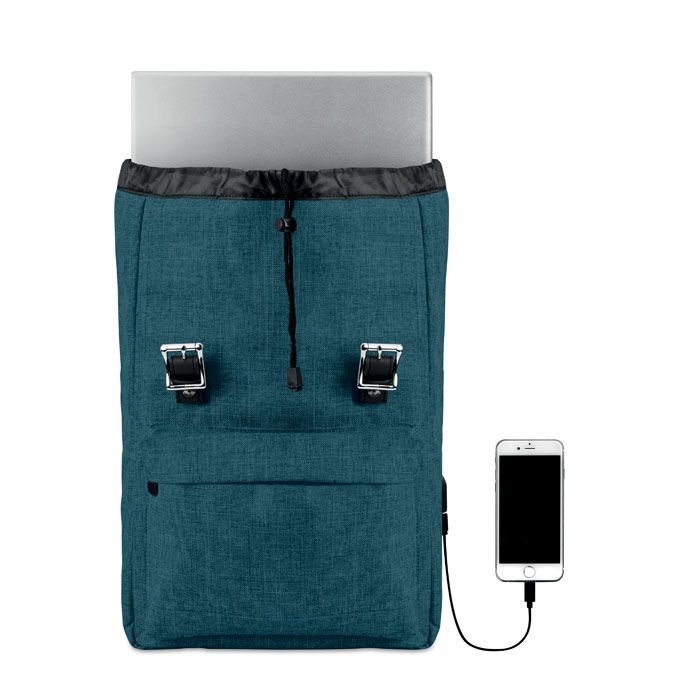 Рюкзак из полиэстера 600D с мягкими шлейками. Внутри 1 отделение для 15-дюймового ноутбука и USB-кабель для зарядки. Декоративные ремни закрываются на магните. Фронтальный карман на молнии.