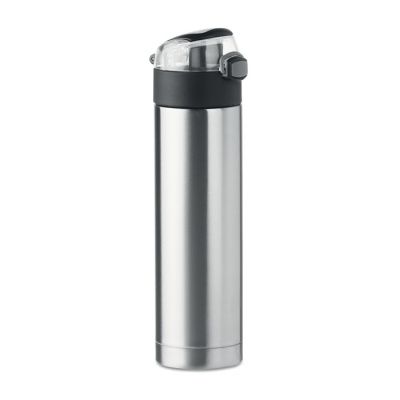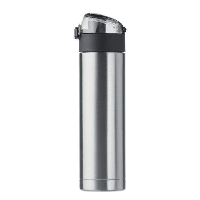 Бутылка для питья с двойными стенками из нержавеющей стали. На крышке защита от открывания. Герметична. Сверху складная ручка для удобной переноски. 400 мл.