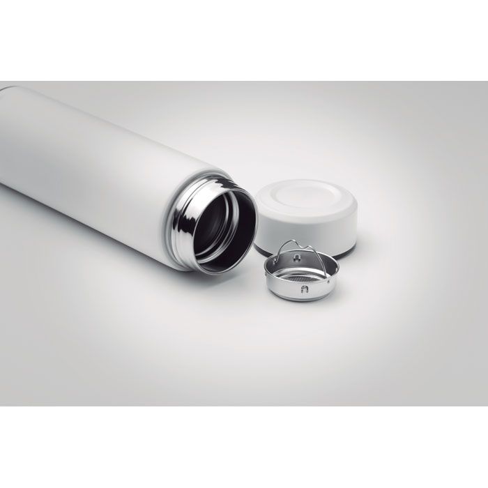 Термос заварочный двустенный, объем 400 мл. Колба из нержавеющей стали. Дополнительно - металлическое чайное сито с возможностью фиксации внутри колбы. Матированное покрытие корпуса. При гравировке металлической части корпуса вскрывается темно-серебристый матовый цвет.