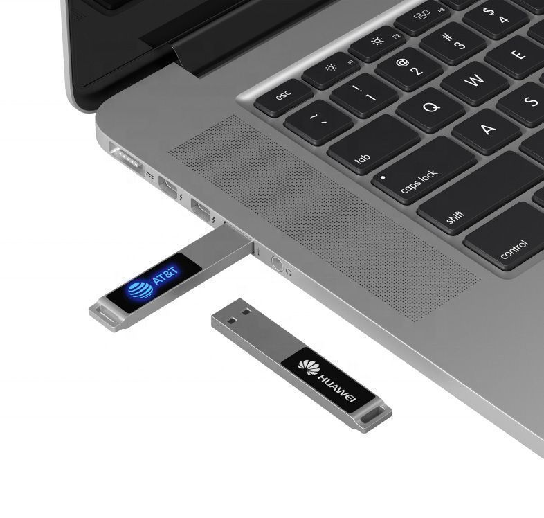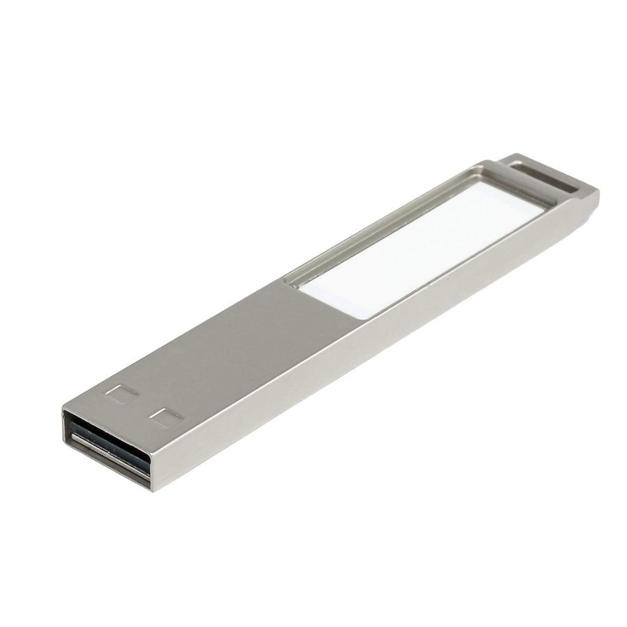 Металлическая флешка с пластиковым шильдом. В зависимости от модели флешки, логотип, выполненный методом лазерной гравировки на шильде подсвечивается синим или белым цветом.