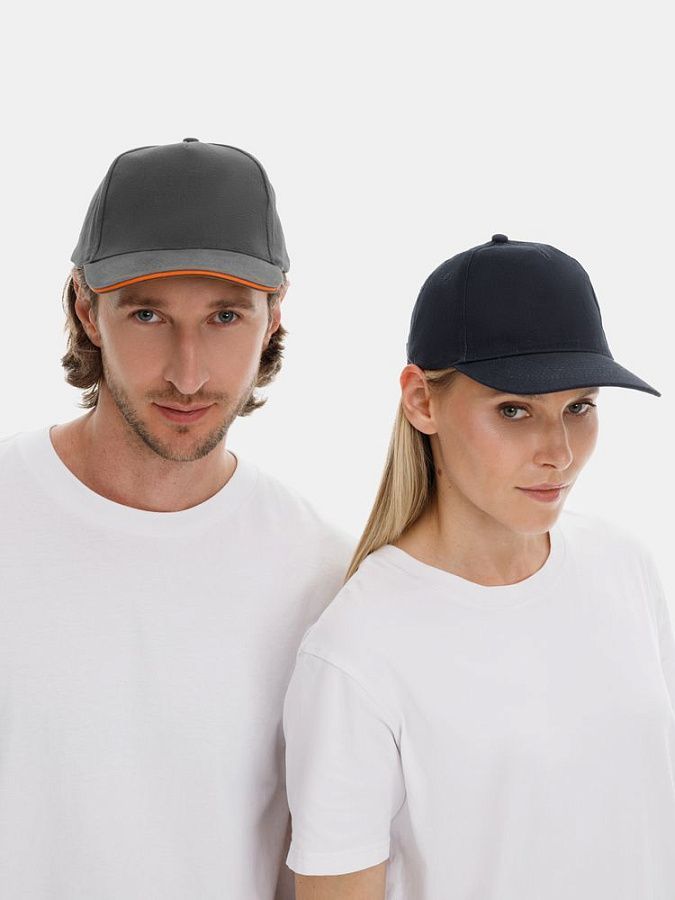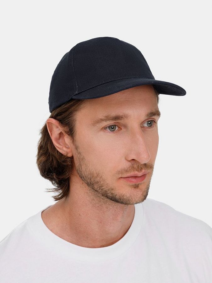 Модель бейсболки с 5-ю клиньями без лобового шва из плотного чесаного хлопка.