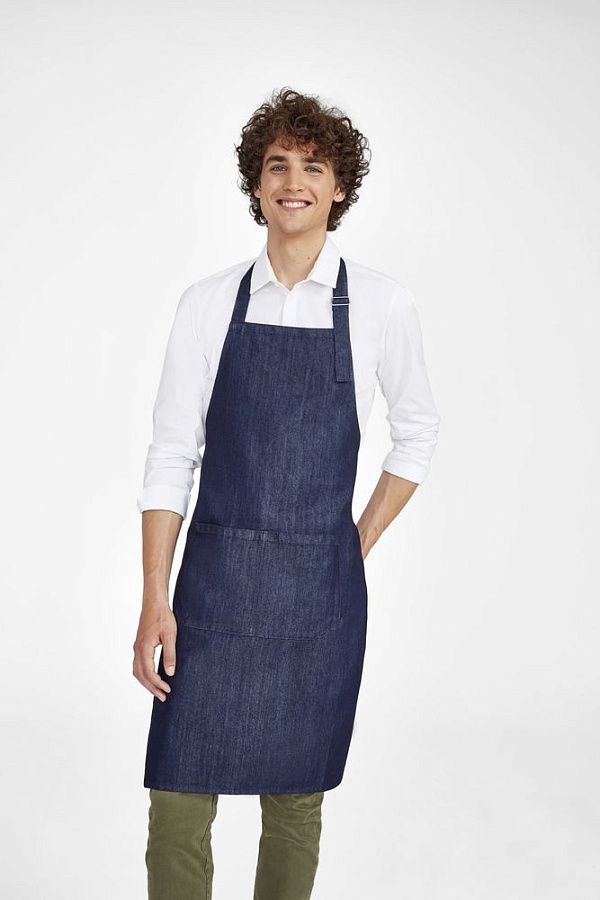 Стильный фартук из сырого денима с большими карманами спереди и регулируемой лямкой.
