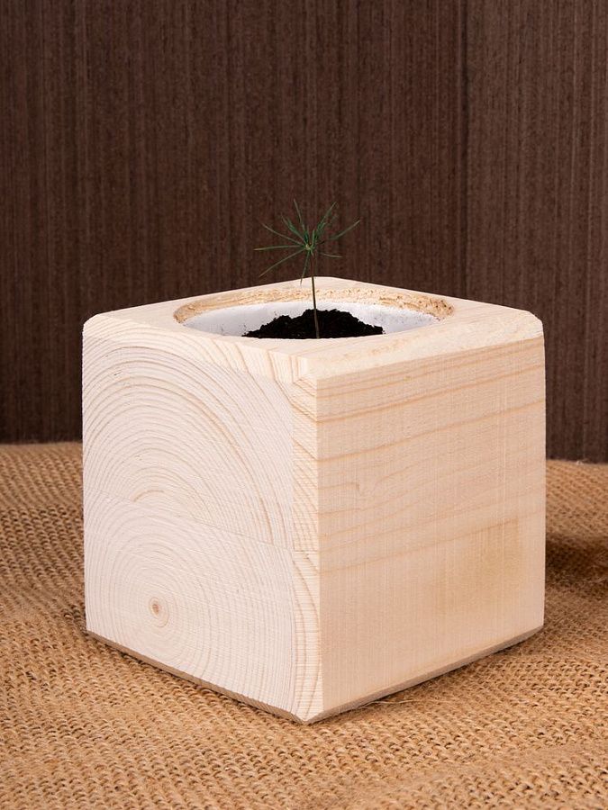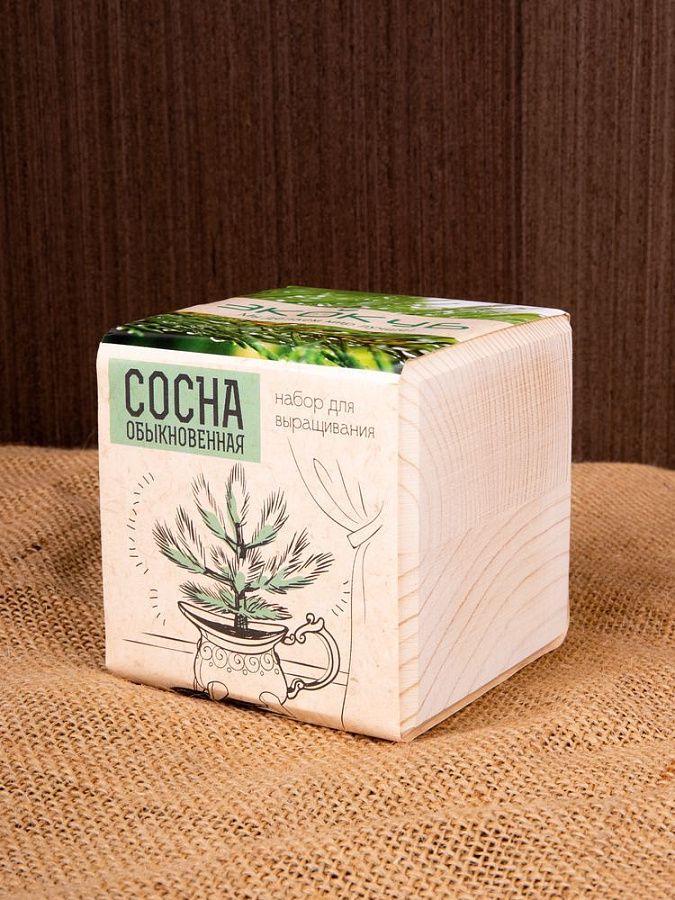 В наборе: деревянный куб, грунт, семена сосны.
