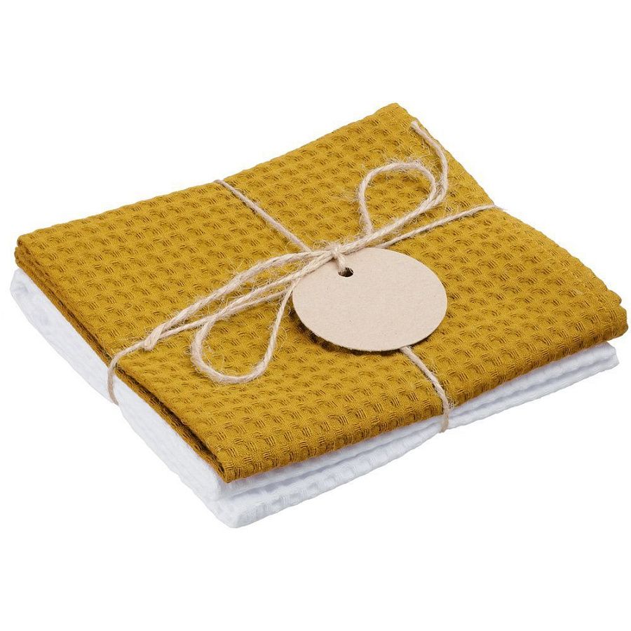 В набор входят 2 кухонных полотенца, перевязанных бечевкой с картонной биркой, на которую можно нанести логотип.