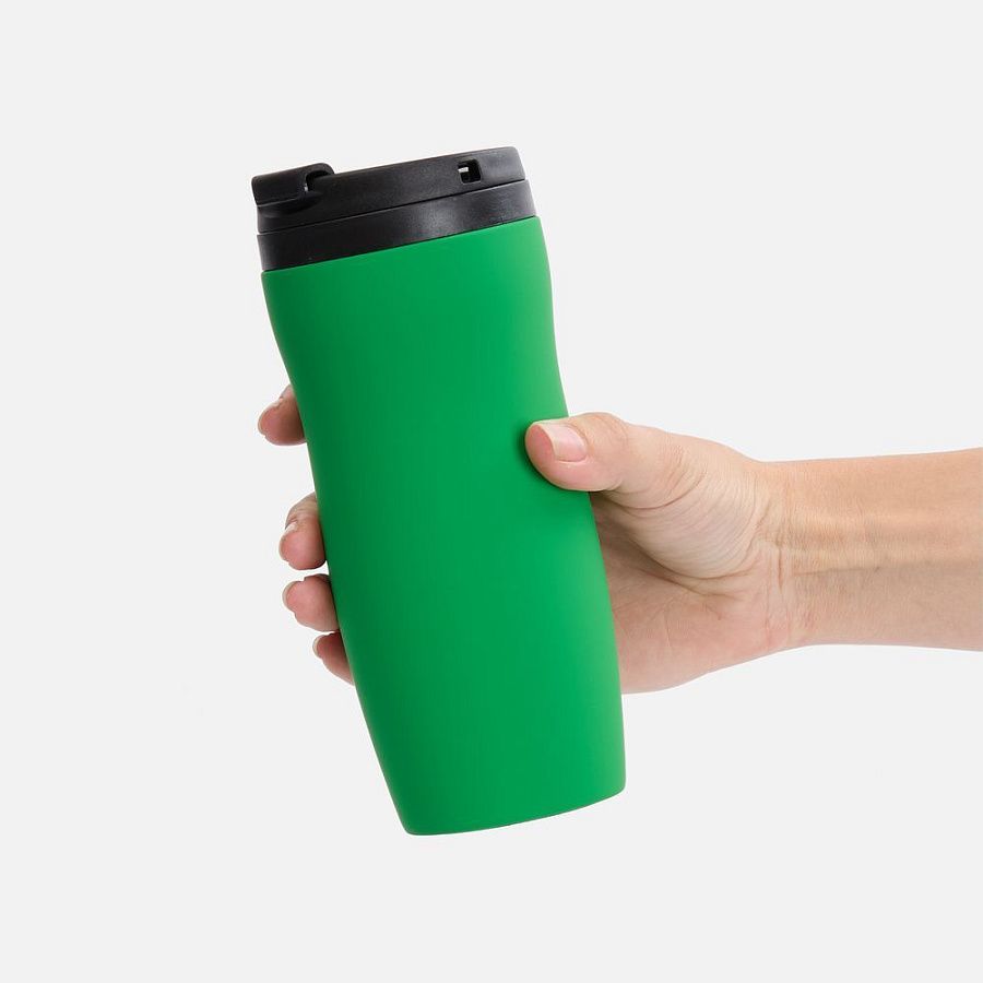 Двухслойная конструкция из нержавеющей стали снаружи и пищевого пластика внутри. Герметичная завинчивающаяся крышка с откидным клапаном для питья. Покрытие софт-тач. В отверстие в крышке можно вставить шнурок для удобного ношения стакана на руке. Шнурок в комплект не входит.