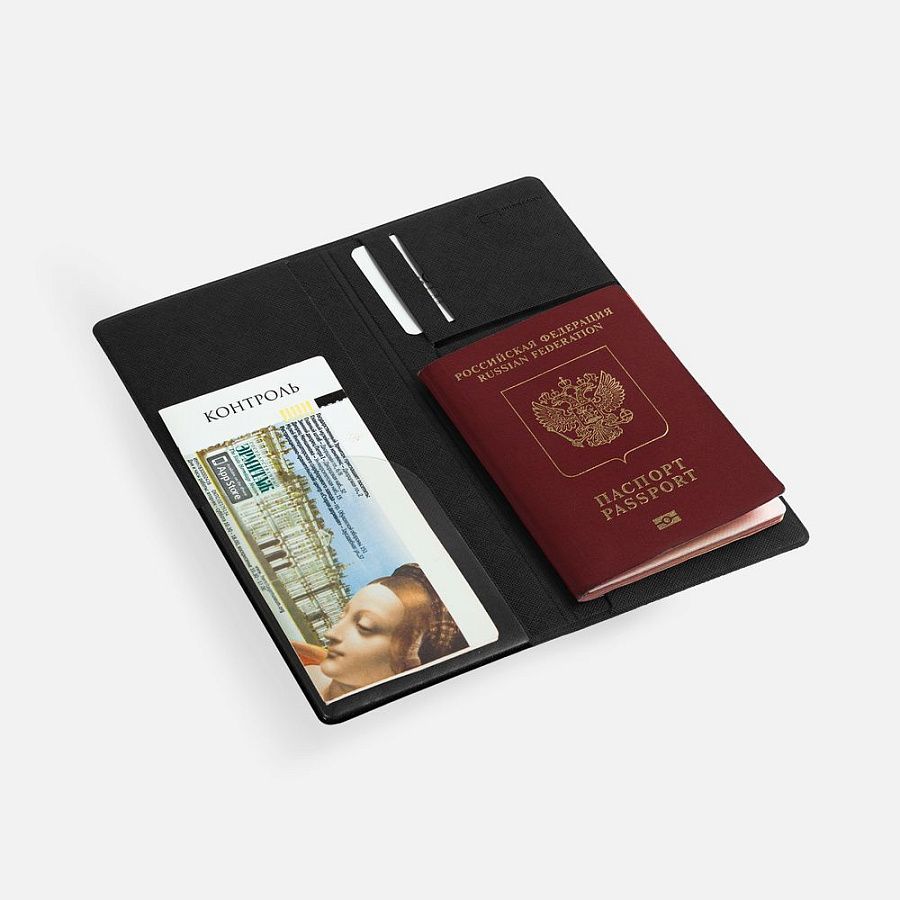 Органайзер из искусственного материала, имитирующего сафьяновую кожу, имеет 5 отделений: для билетов, паспорта, визиток или кредитных карт.