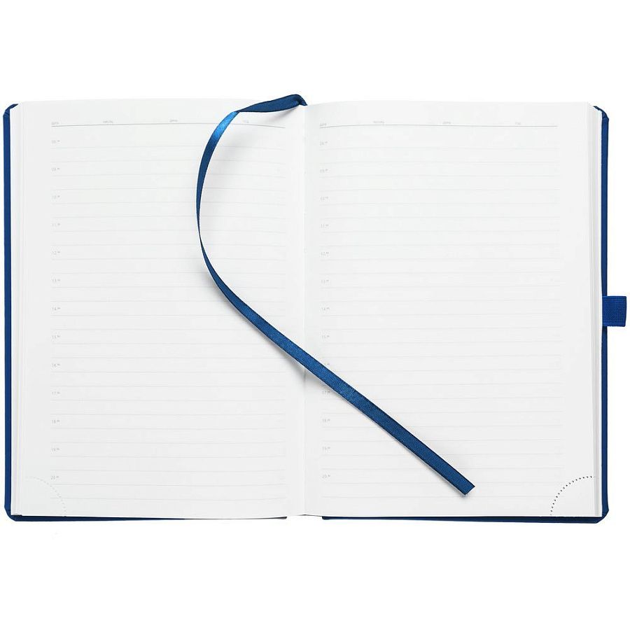 Ежедневник с твердой обложкой без поролона, выполнен из материала Soft Touch Ultra, синий НН, дополнен резинкой шириной 1 см, петлей-резинкой для ручки, капталом и ляссе синего цвета.