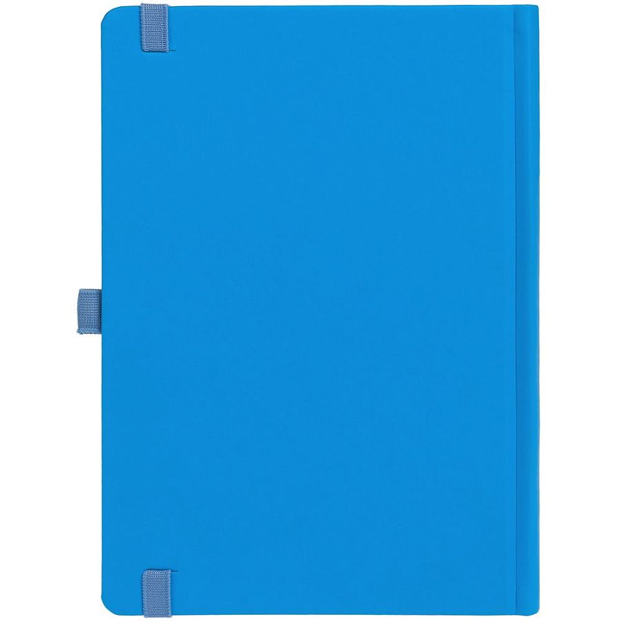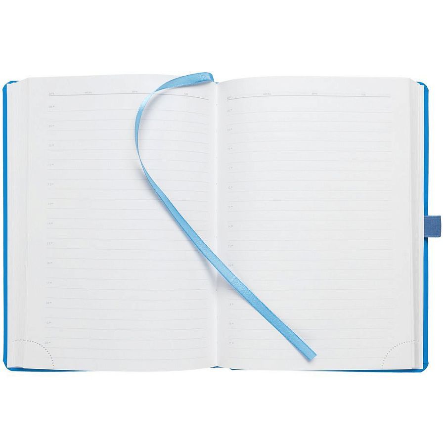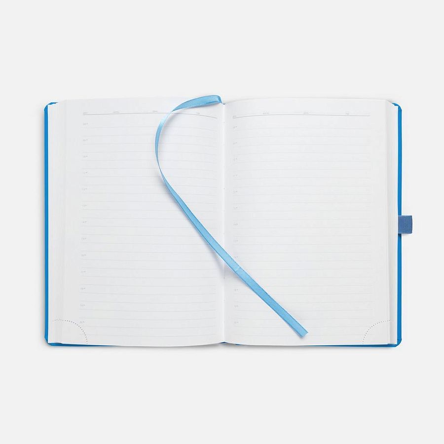 Ежедневник с твердой обложкой без поролона, выполнен из материала Soft Touch Ultra, голубой JJ, дополнен резинкой шириной 1 см, петлей-резинкой для ручки, капталом и ляссе голубого цвета.