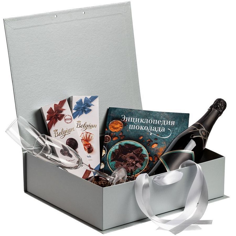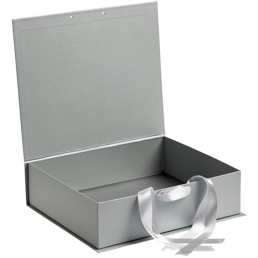 Коробка выполнена из переплетного картона, кашированного дизайнерской бумагой Malmero, с крышкой на лентах.