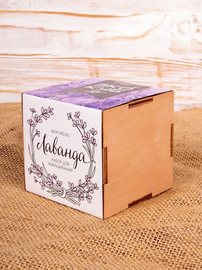В наборе: деревянный куб, бумажный стаканчик, питательный грунт, семена, вермикулит.