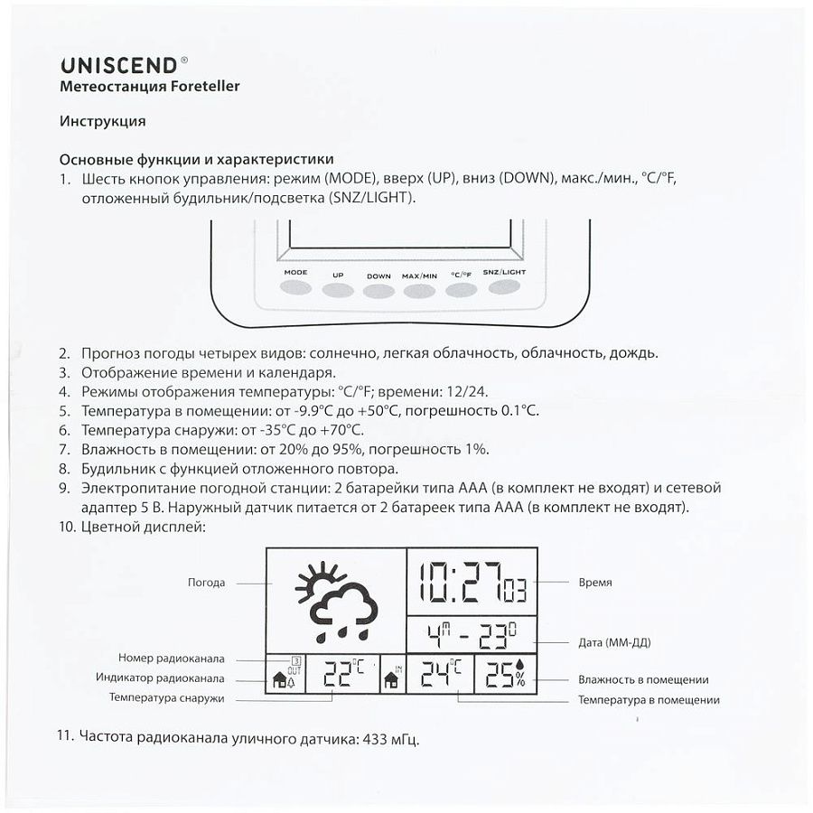 - Диапазон измеряемых уличных температур: -35–60 °C, погрешность 1 °C