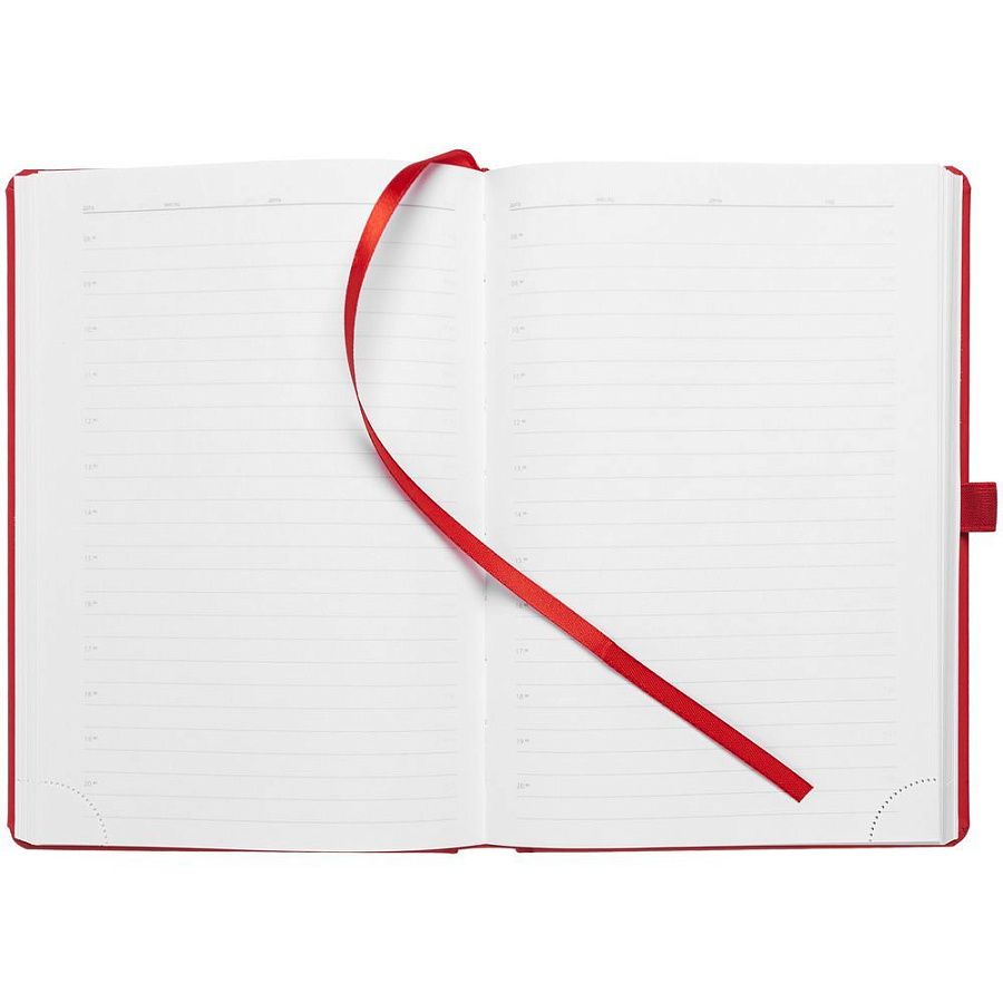 Ежедневник с твердой обложкой без поролона, выполнен из материала Soft Touch Ultra, красный РР, дополнен резинкой шириной 1 см, петлей-резинкой для ручки, капталом и ляссе красного цвета.