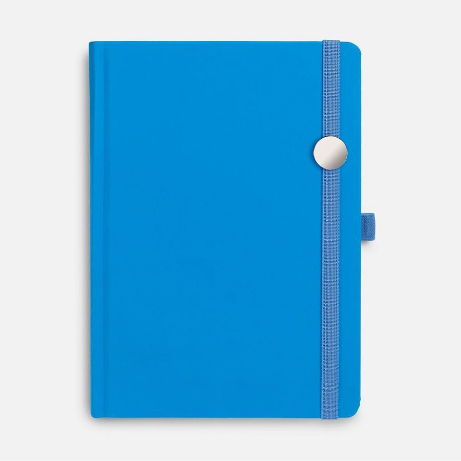Ежедневник с твердой обложкой без поролона, выполнен из материала Soft Touch Ultra, голубой JJ, дополнен резинкой шириной 1 см, петлей-резинкой для ручки, капталом и ляссе голубого цвета.